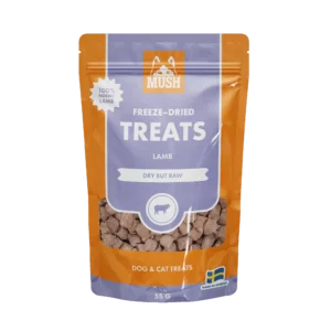 MUSH TREATS LAMM är ett frystorkat kompletteringsfoder för hundar och katter.